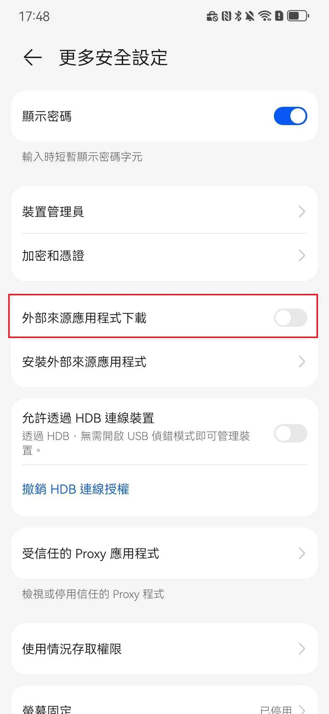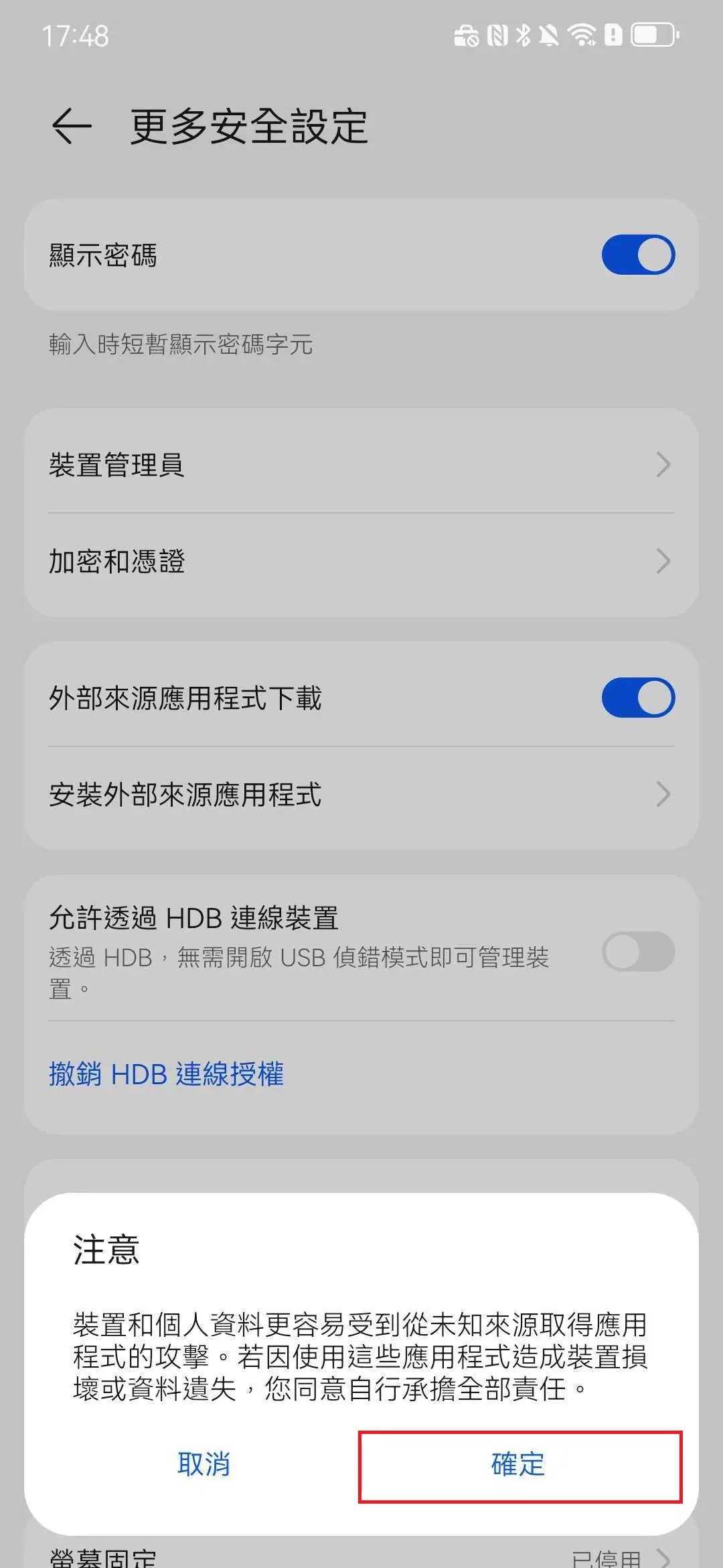 「允許安裝未知應用」只在安裝時開啟,安裝完成後建議關閉。