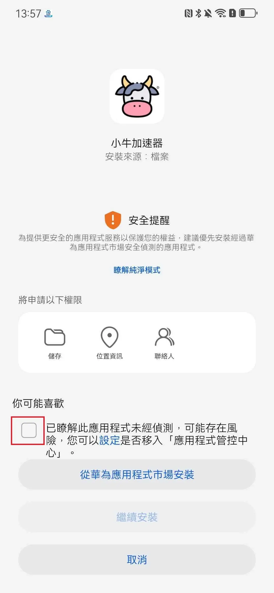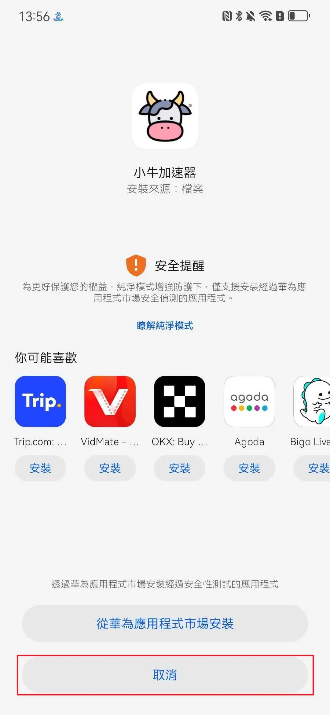 安裝時若遇到安全提醒,沒有「安裝」按鈕,請先點擊「取消」。